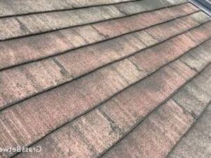 屋根は全体的に塗膜の色褪せと、黒ずみ汚れが広範囲に広がっていました。